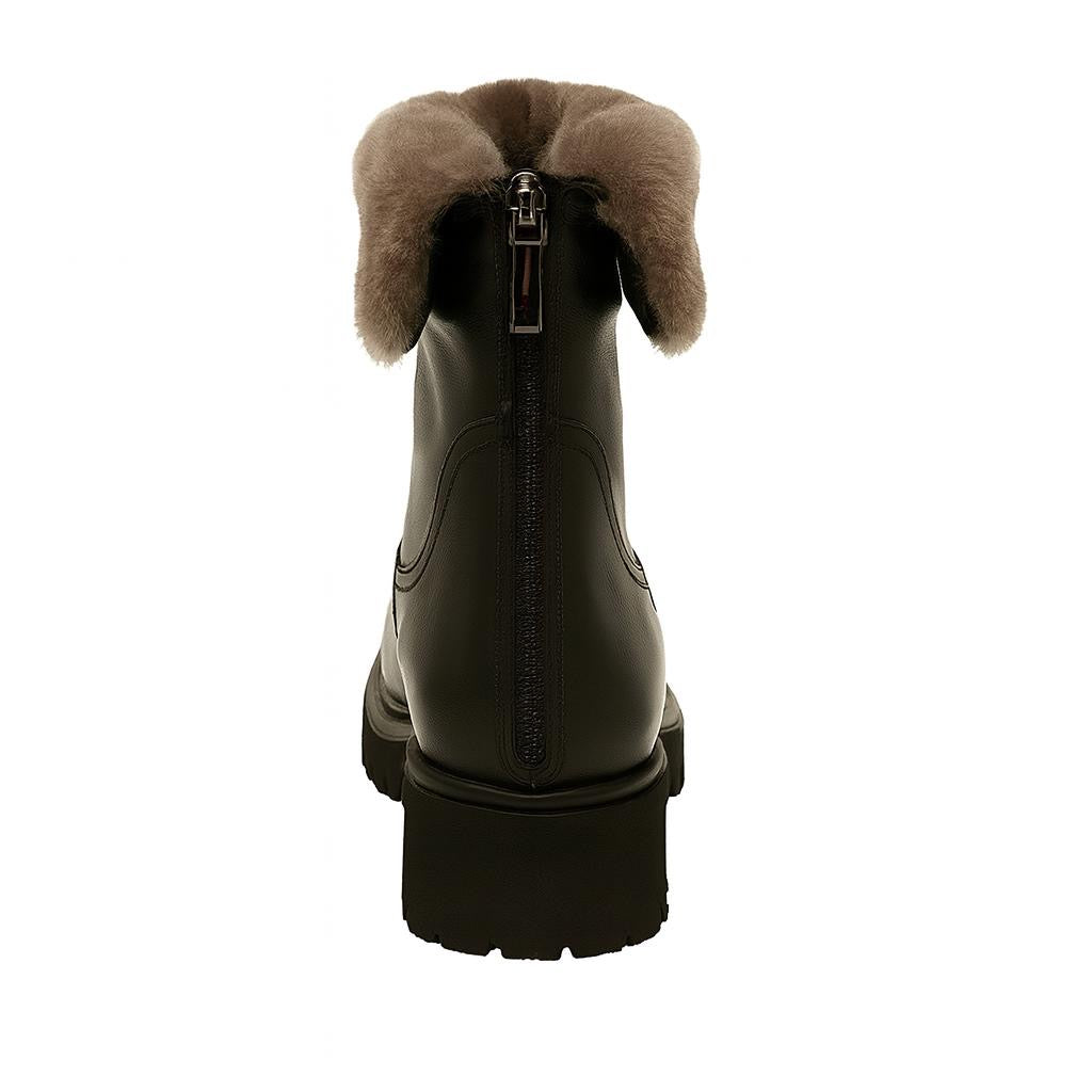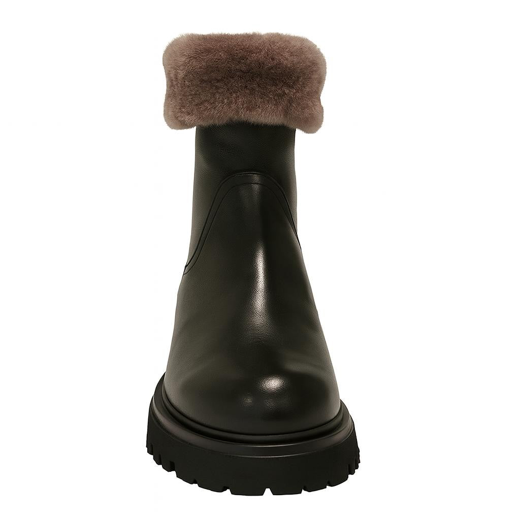 Step into effortless winter style with these black leather ankle boots, designed to combine warmth, comfort, and contemporary edge. Crafted from premium smooth leather, these boots are fully lined with luxurious shearling that folds over at the cuff for a cozy and stylish finish.