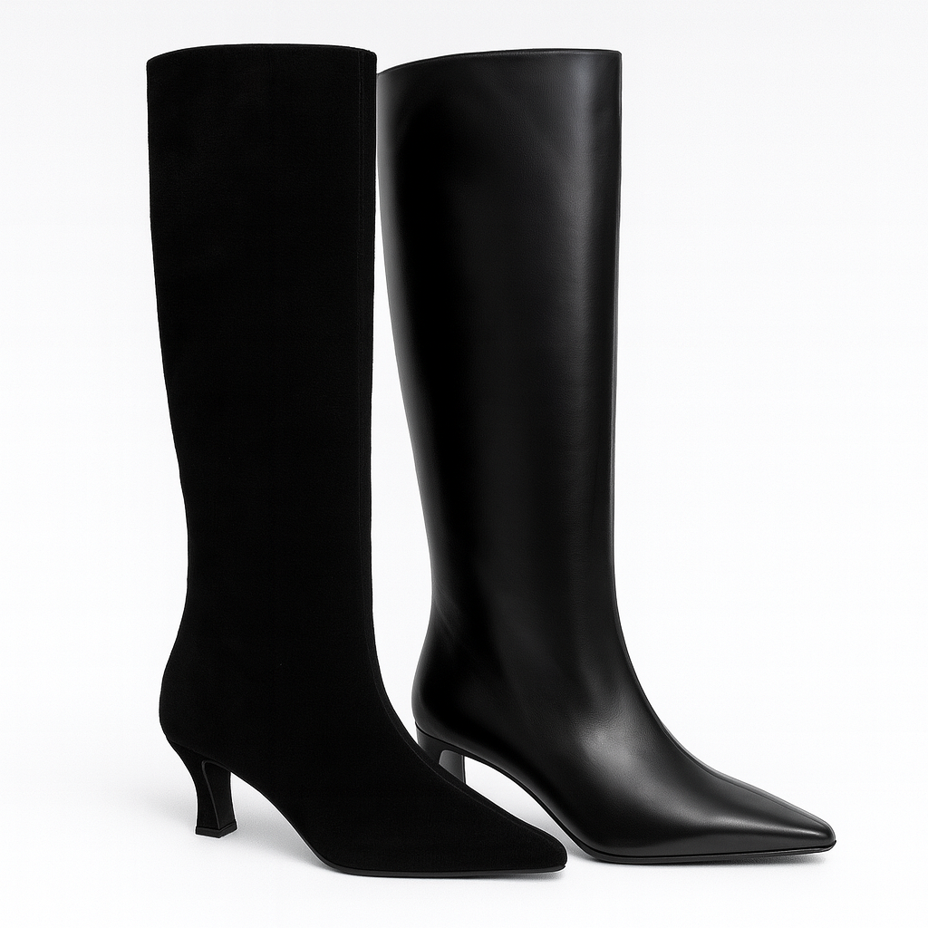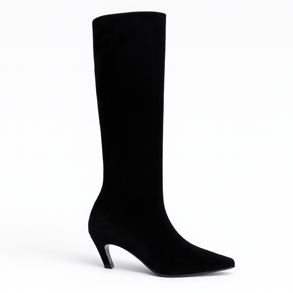 Our Amore Boots are the perfect way to finish anything in your winter wardrobe. Italian-made from smooth and supple nappa in rich black, the classic knee-length silhouette is designed with a sleek pointy toe and is fashioned on a comfortable  heel.
