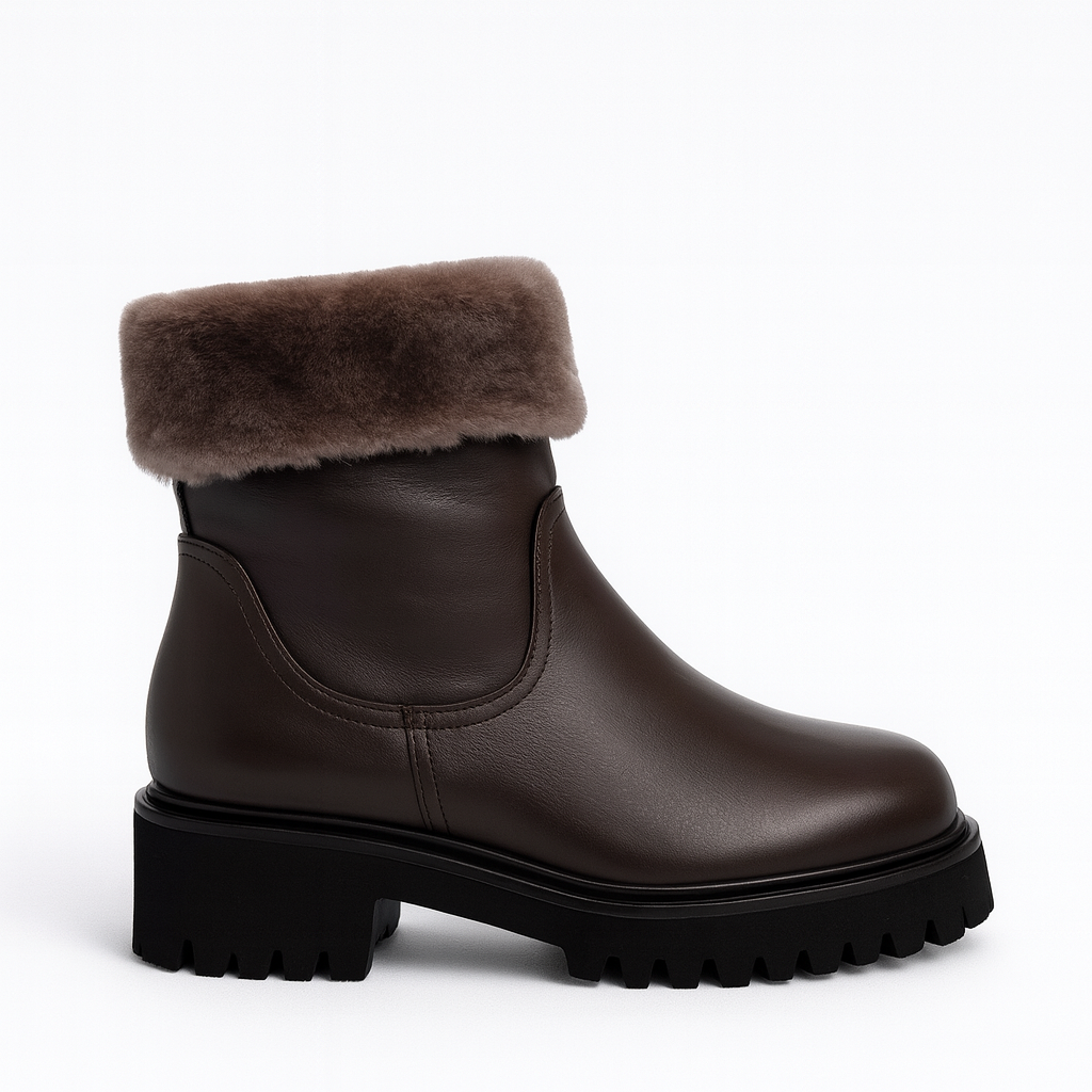 Step into effortless winter style with these black leather ankle boots, designed to combine warmth, comfort, and contemporary edge. Crafted from premium smooth leather, these boots are fully lined with luxurious shearling that folds over at the cuff for a cozy and stylish finish.