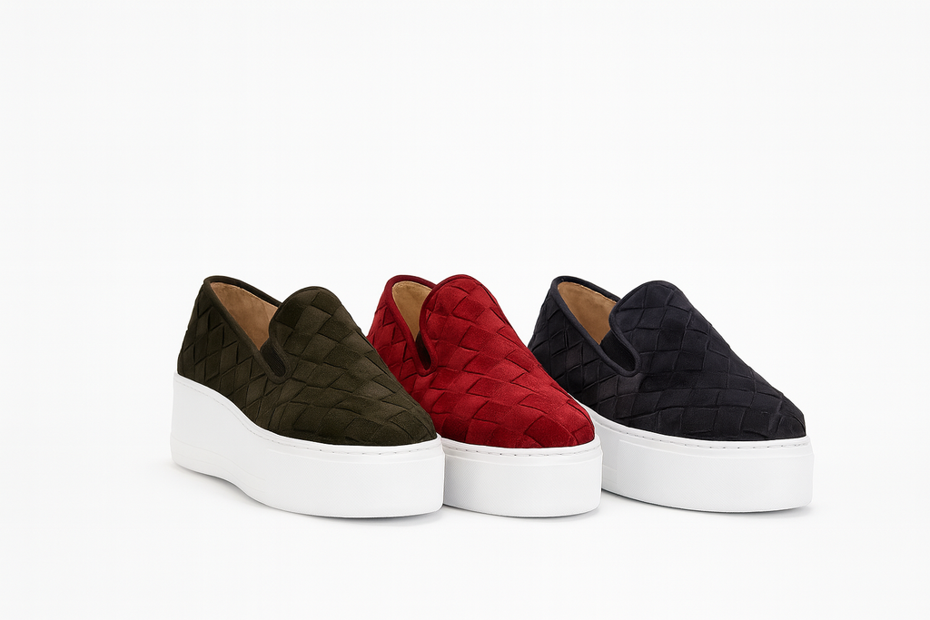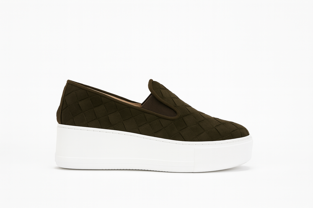 Our platform sneakers are part of the New collection. This fashion sporty sneaker crafted from finest woven suede and leather lining. An easy to wear slip on laceless style featuring concealed elasticated inserts to the tongue. The classic round toe and platform unit make up the silhouette.