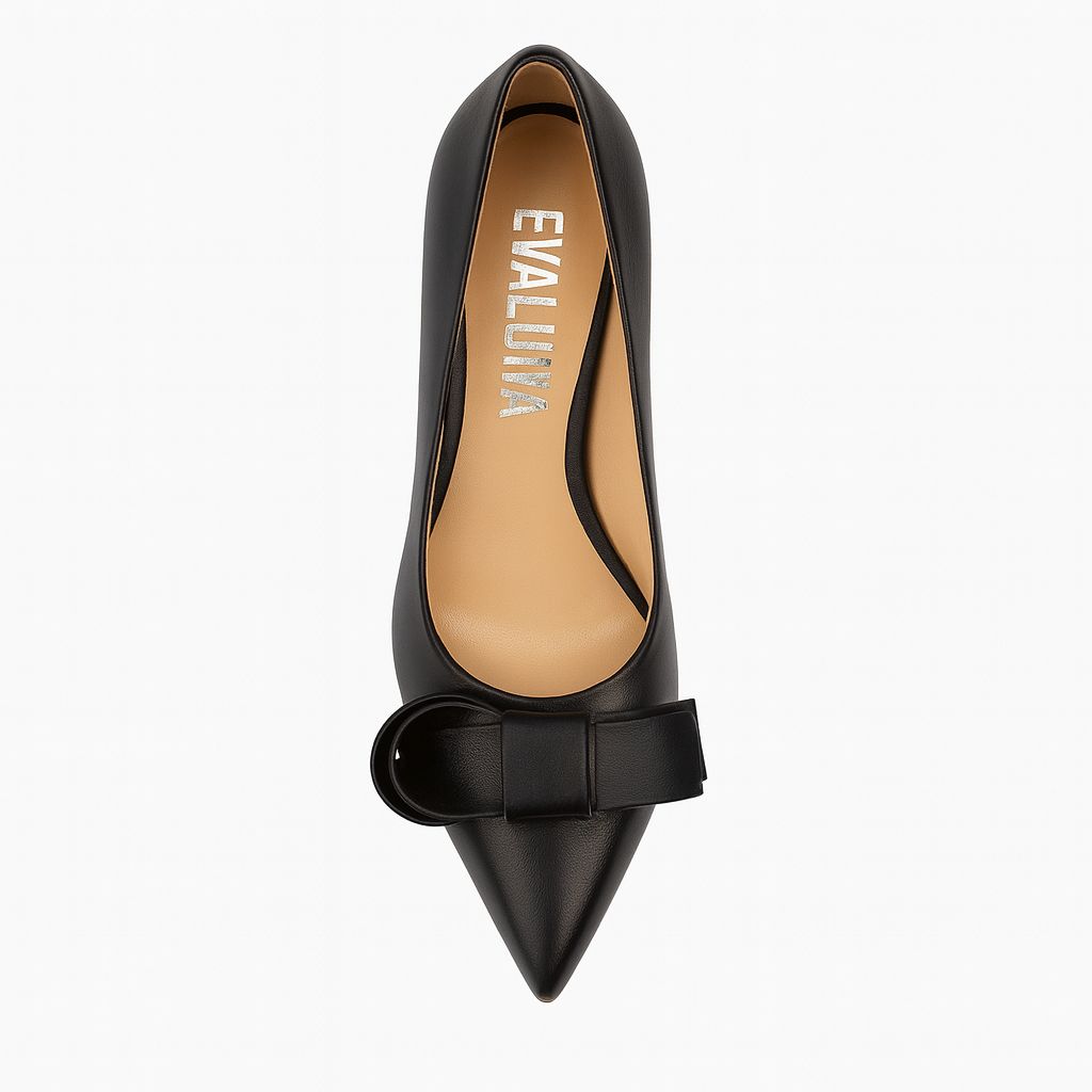 Refined elegance meets modern femininity in these exquisite Evaluna pumps. Handcrafted in Italy from premium black leather, these heels feature a pointed toe design adorned with a sculptural bow detail that adds a touch of sophistication. The soft leather interior ensures all-day comfort, while the gracefully shaped heel offers stability and poise.