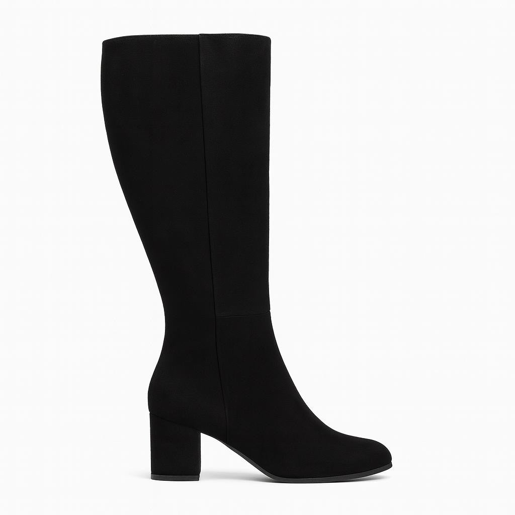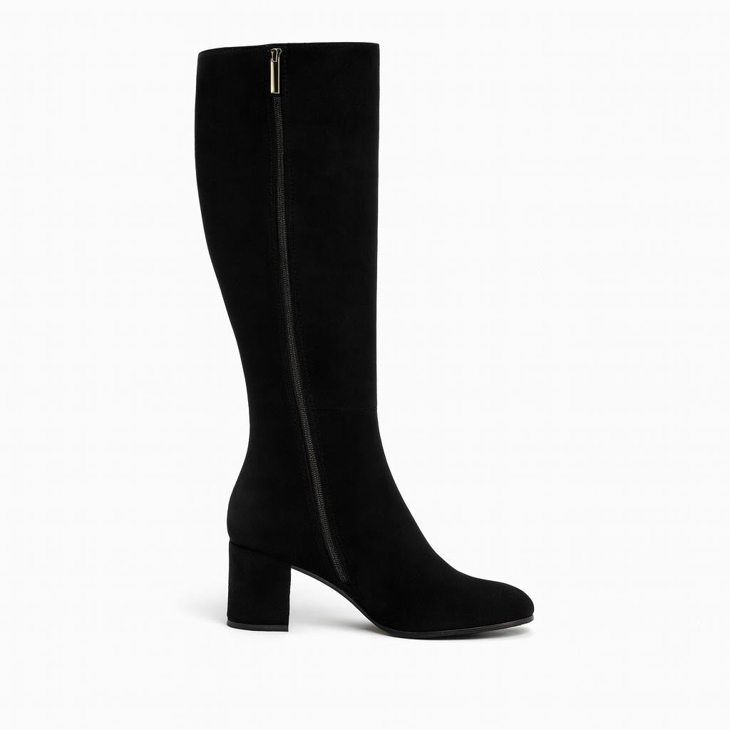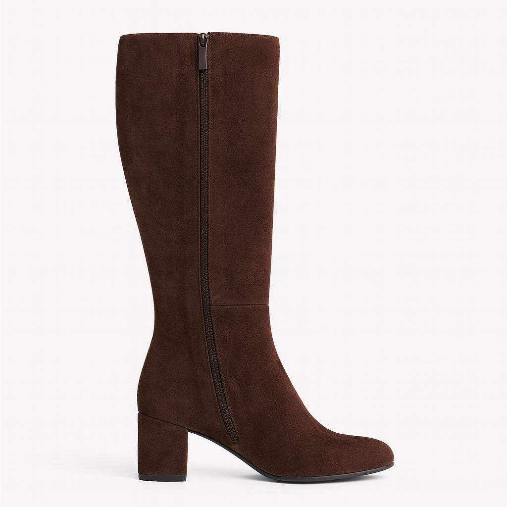 Every woman's wardrobe should include a timeless knee-high boot Made in Italy from velvety suede in brown , the style is shaped to a feminine, rounded toe and is finished on a comfortable, block heel. Work yours with anything from denim to dresses.